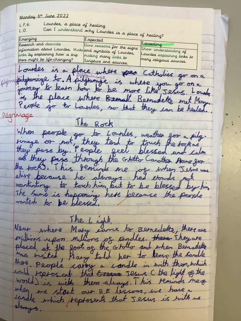 We assess our children in RE using the Nottingham Diocese End of Year Expectations document, which uses key driver words for each year group. We make use of external and internal moderation opportunities to ensure the quality of teacher’s judgments, as well as book scrutinies to ensure work is engaging and is sufficiently challenging for all pupils.